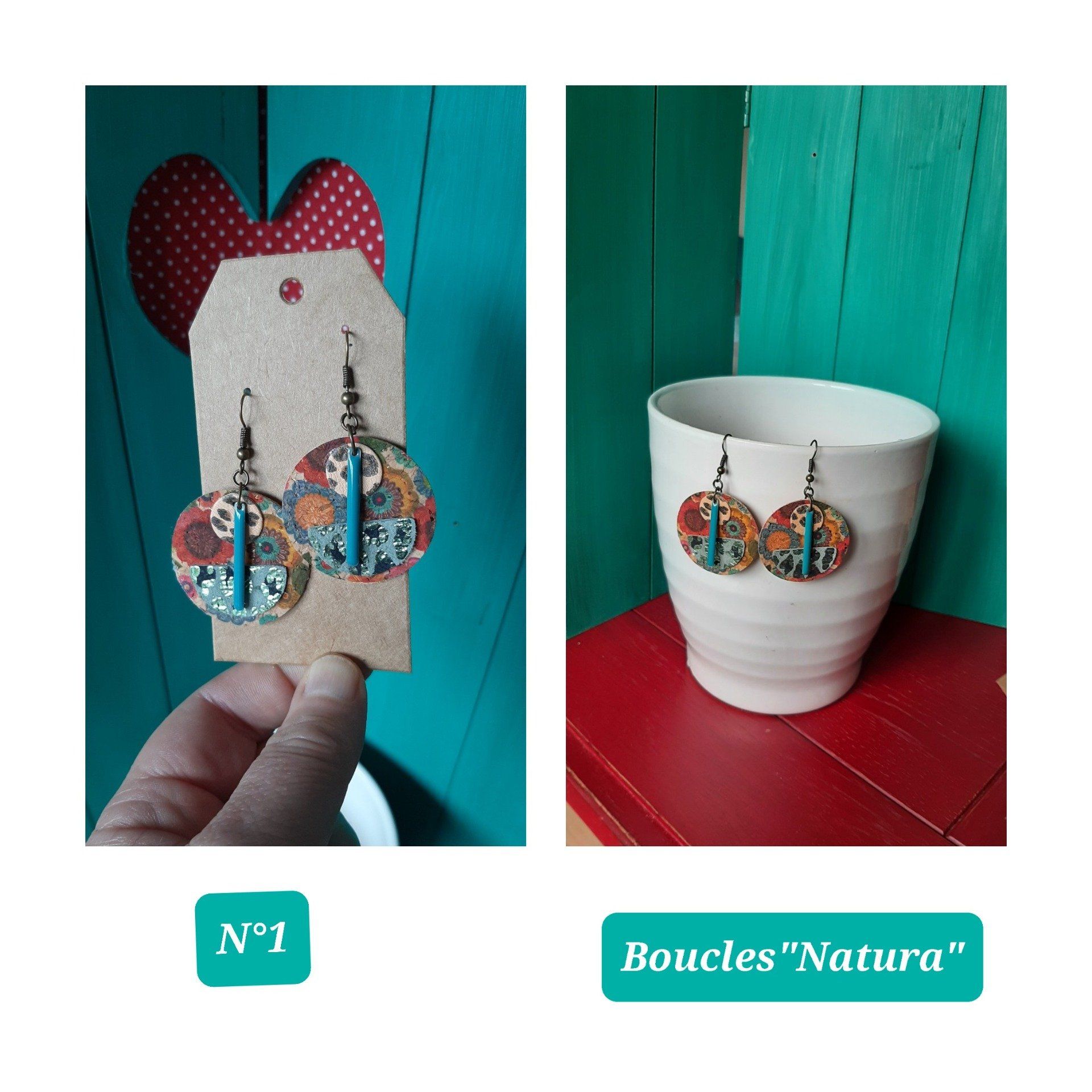 Les boucles d'oreilles sont confectionnées avec des chutes de tissu et de liège .