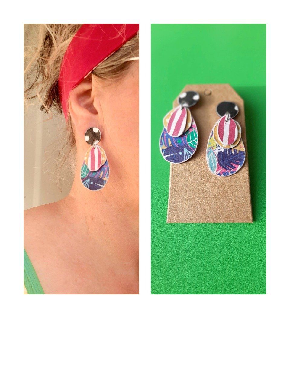 Boucles d'oreilles en papier,chaque fragment est sélectionné avec soin avant de le transformer à la main et soigneusement vitrifié.