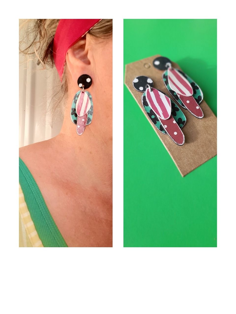 Boucles d'oreilles en papier,chaque fragment est sélectionné avec soin avant de le transformer à la main et soigneusement vitrifié.