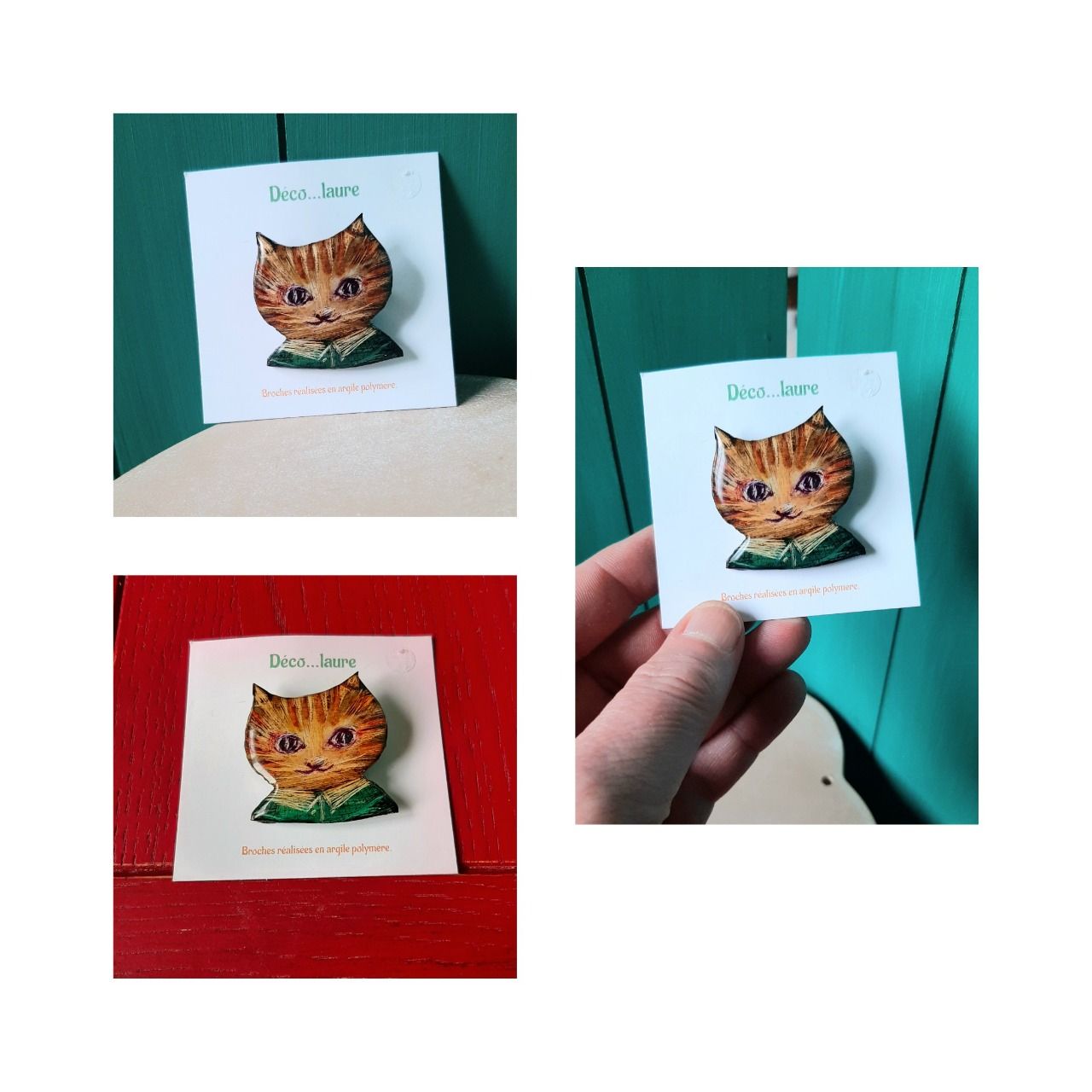 Broche Chat,forme dessinée et découpée dans l argile polymère,motifs peints à la main .