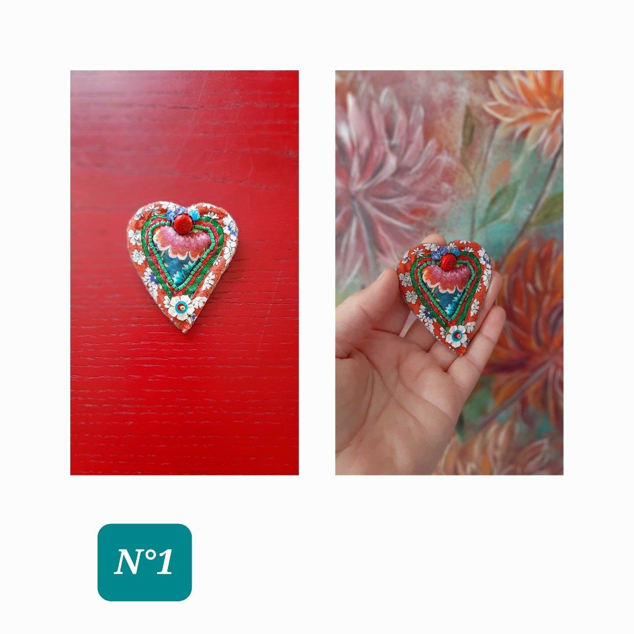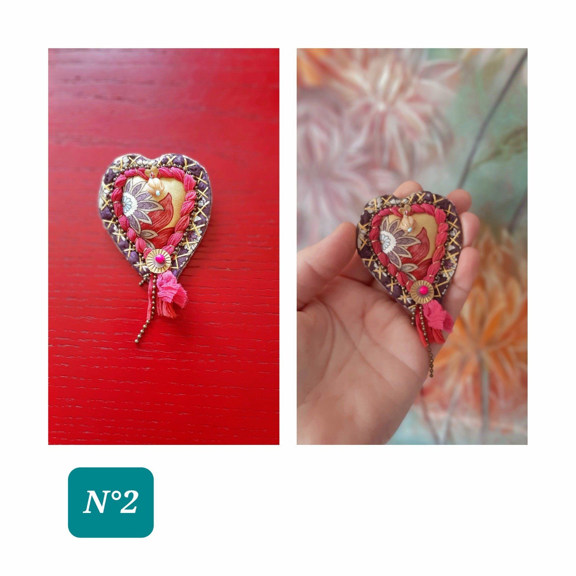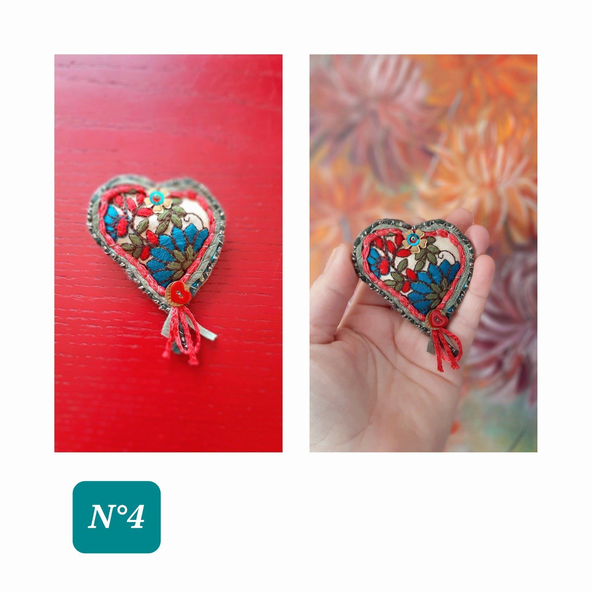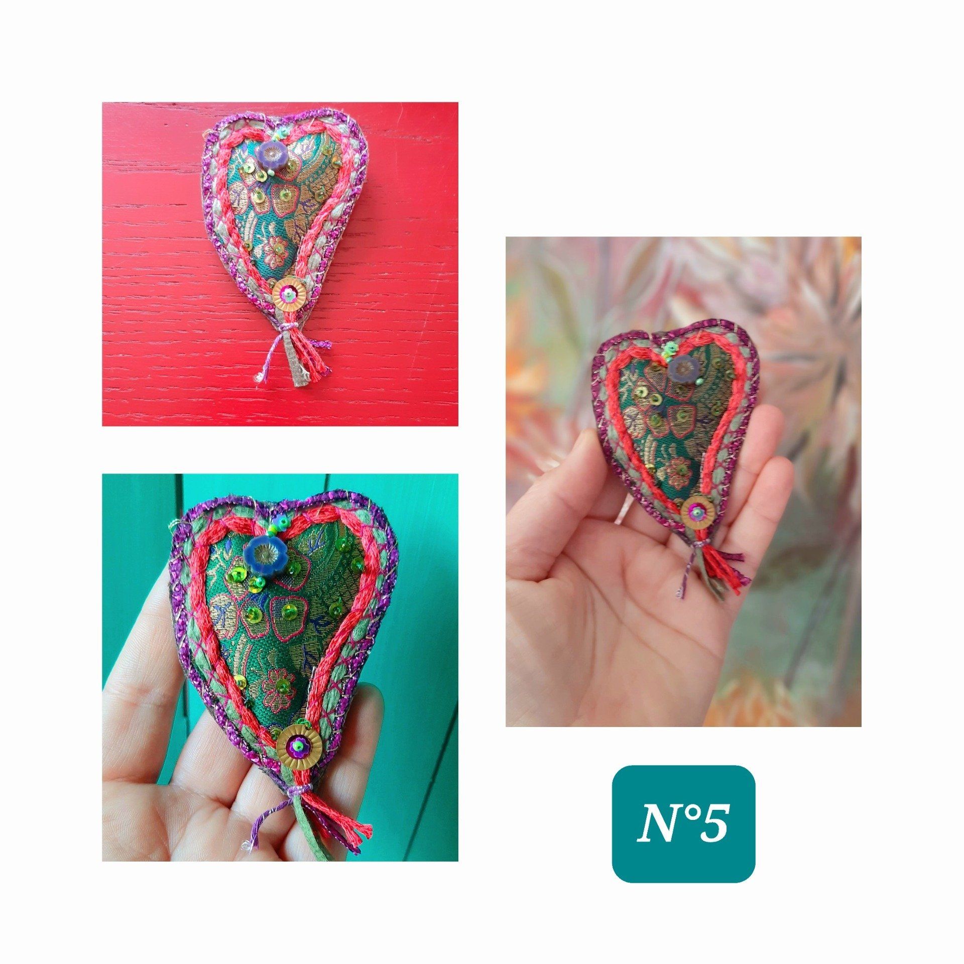 Broche coeur brodée sur du tissu avec des perles , fils ,cotons,rubans .